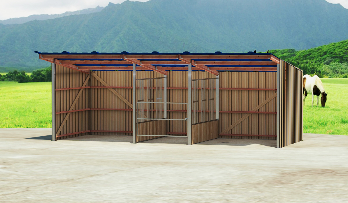 Découvrez l’abri 3 x 10 ECO avec râtelier central – Protection et alimentation optimales pour vos chevaux !