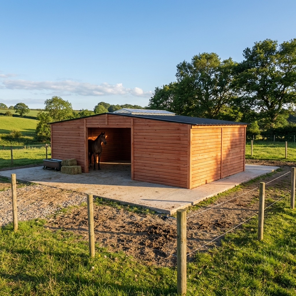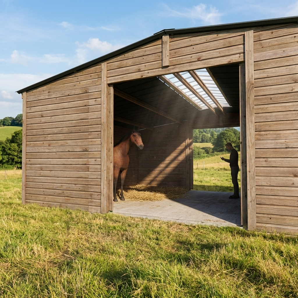 Ce double abri avec couloir central est une alternative idéale pour les écuries, élevages ou pensions souhaitant une structure évolutive, solide et parfaitement adaptée à la vie du troupeau.
